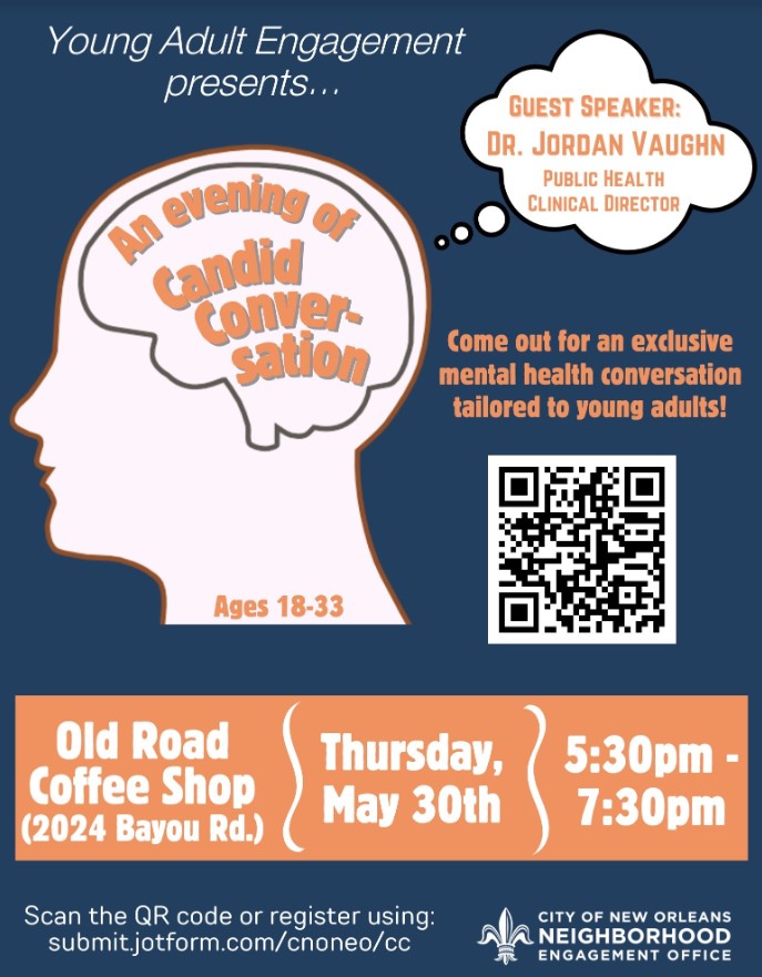 Ready to dive into a candid conversation about mental health? Come out May 30th at 5:30 pm for an exclusive Candid Conversation event tailored for young adults.